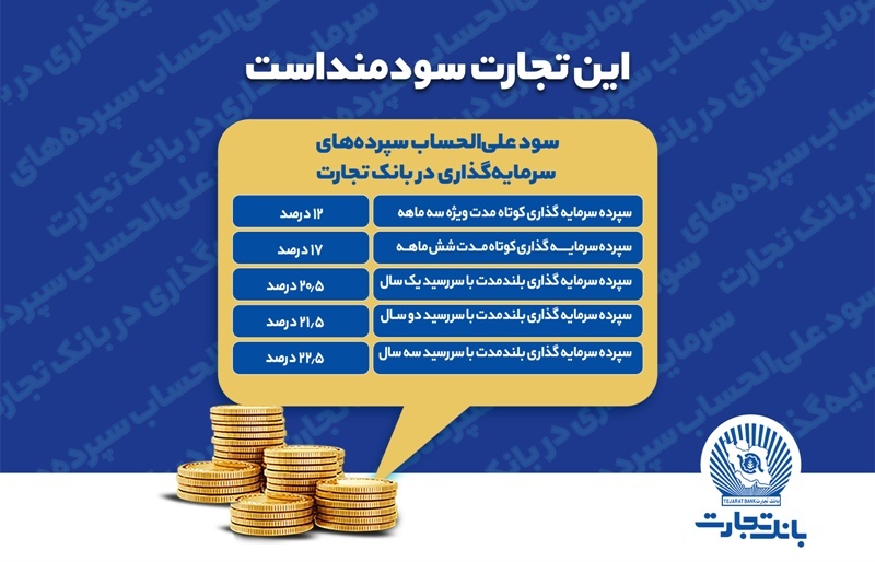 اقتصاد۲۴- بر اساس این بخشنامه، بانک تجارت به سپردههای سرمایهگذاری کوتاهمدت عادی ۵ درصد، ویژه سهماهه ۱۲ درصد، ویژه ششماهه ۱۷ درصد و سپرده سرمایهگذاری بلندمدت با سررسید یک ساله ۲۰.۵ درصد، دو ساله ۲۱.۵ درصد و سه ساله ۲۲.۵ درصد سود پرداخت میکند.