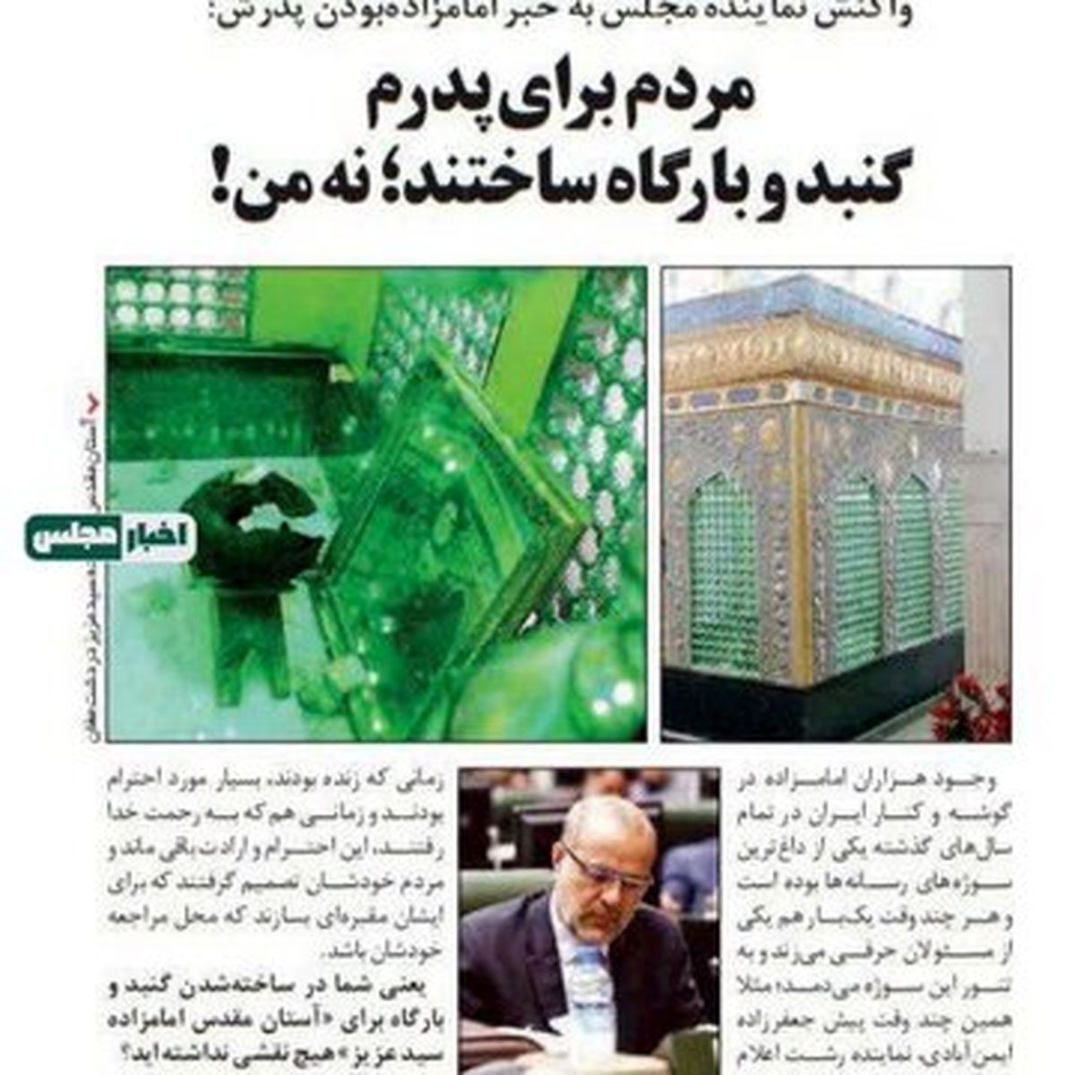 اقتصاد۲۴- نماینده مجلس در واکنش به این خبر گفت که مردم برای پدرش بارگاه و مقبره درست کرده اند. او گفته: «پدر مرحوم من یک سیدی بود که مردم او را صاحب کرامت میشناختند و برای ایشان احترام زیادی قایل بودند... اینها قبل از اینکه من نماینده بشوم، ساخته شده بود»