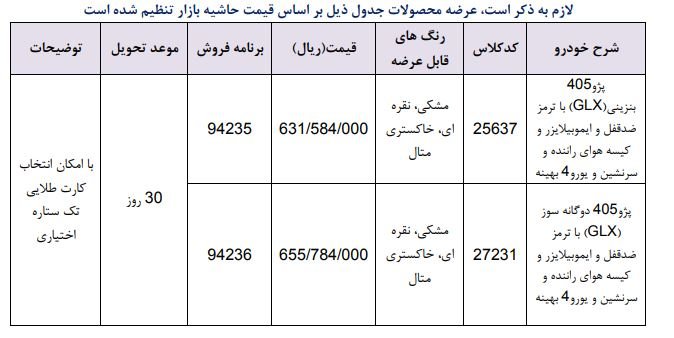 اقتصاد24 - بر اساس اعلام شرکت ایران خودرو ، فروش فوری پژو۴۰۵ بنزینی(GLX) با ترمز ضدقفل و ایموبیلایزر و کیسه هوای راننده و سرنشین و یورو۴ بهینه با قیمت ۶۳ میلیون و ۱۵۸ هزار و ۴۰۰ تومان و پژو۴۰۵ دوگانه سوز(GLX )با ترمز ضدقفل و ایموبیلایزر و کیسه هوای راننده و سرنشین و یورو۴ بهینه ۶۵ میلیون و ۵۷۸ هزار و ۴۰۰ تومان انجام می‌شود.