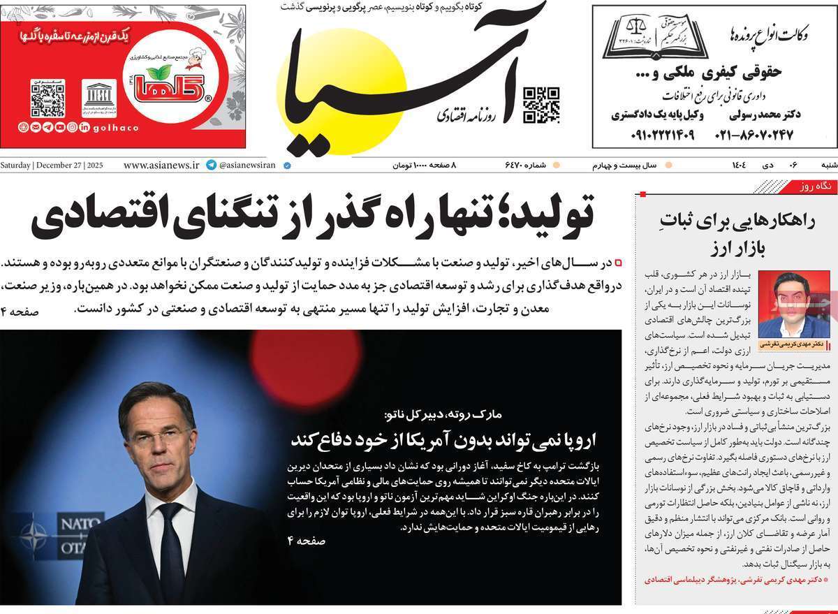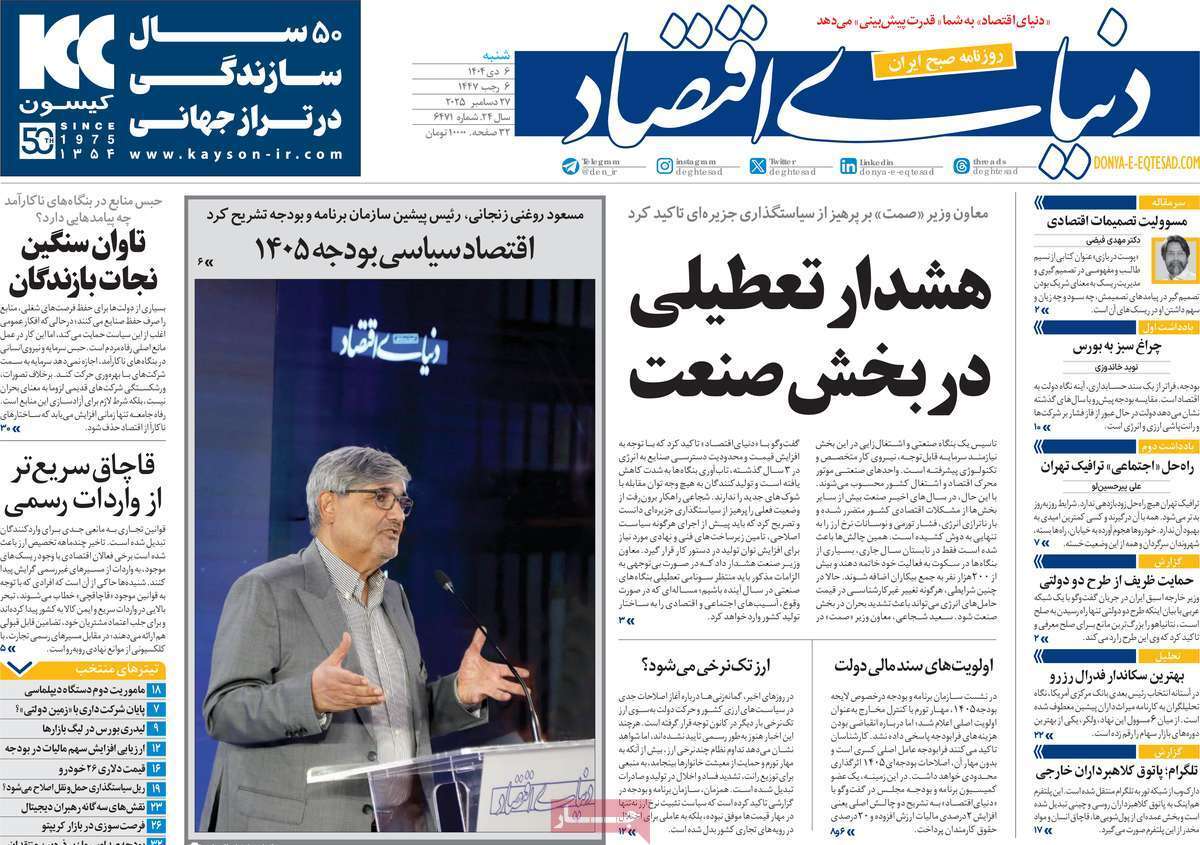 صفحات نخست روزنامههای اقتصادی کشور دنیای اقتصاد، تعادل آفتاب اقتصادی، اقتصاد ملی، اقتصاد مردم، اسکناس، ابرار اقتصادی، کسب و کار، جهان صنعت، آفتاب اقتصادی، عصر اقتصاد، جهان اقتصاد، آسیا، صمت و دنیای خودرو، امروز شنبه ۶ دی ماه ۱۴۰۴ را ببینید.