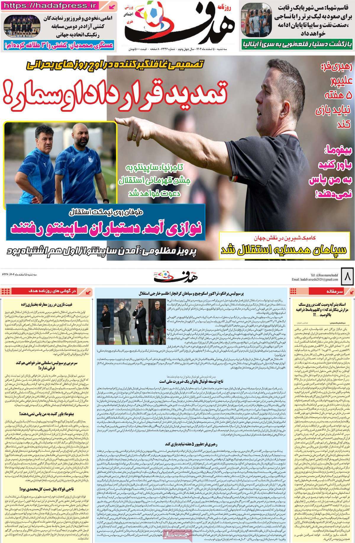 صفحه اول روزنامه‌های ورزشی امروز ۵ اسفند