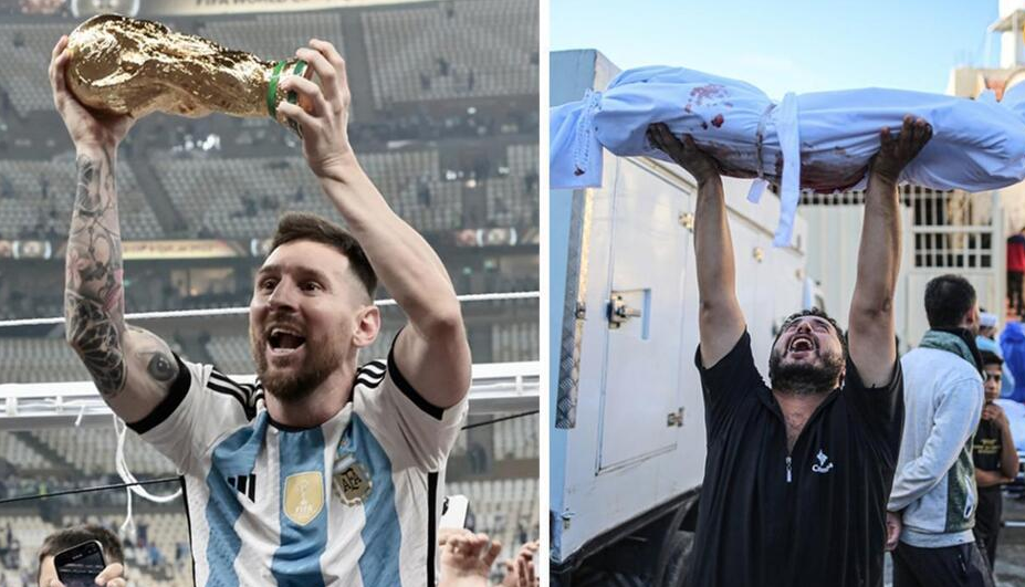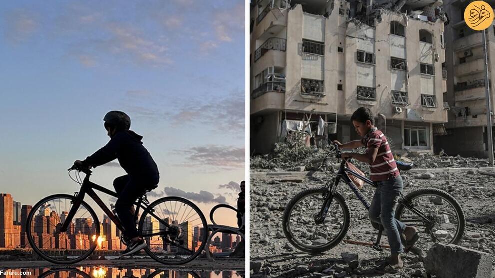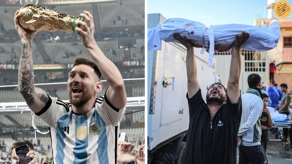 اقتصاد ۲۴- در حالی که زندگی در سراسر جهان بهویژه در کشورهای غربی به روال عادی خود ادامه میدهد، مردم غزه جایی که حملات اسرائیل ادامه دارد، ویرانی و فاجعه نسلکشی را تجربه میکنند. از بالا بردن جام جهانی توسط لیونل مسی تا مرد فلسطینی که جسد پیچیده در کفن فرزندش را بالا گرفته، از هیجان و آتش بازی سال نو تا حملات موشکی اسرائیل به غزه، از چهره نقاشی شده یک زن در جشنواره تا صورت زخمی و خونین زن فلسطینی، از آسمانخراشهای نیویورک تا ساختمانهای ویران شده غزه، از شلوغی خرید سال جدید تا مهاجرت صدها هزار فلسطینی، از توریستهایی سوار بر کالسکه تا انتقال مجروحان حملات اسرائیل به بیمارستان با گاری، از جشنوارهای در اسپانیا تا تشییع جنازه خبرنگاری که در غزه جان خود را از دست داد و دو کودک با دوچرخه یکی در امنیت و دیگری در ویرانههای غزه، این تصاویر در شبکههای اجتماعی با هم مقایسه شده اند.
