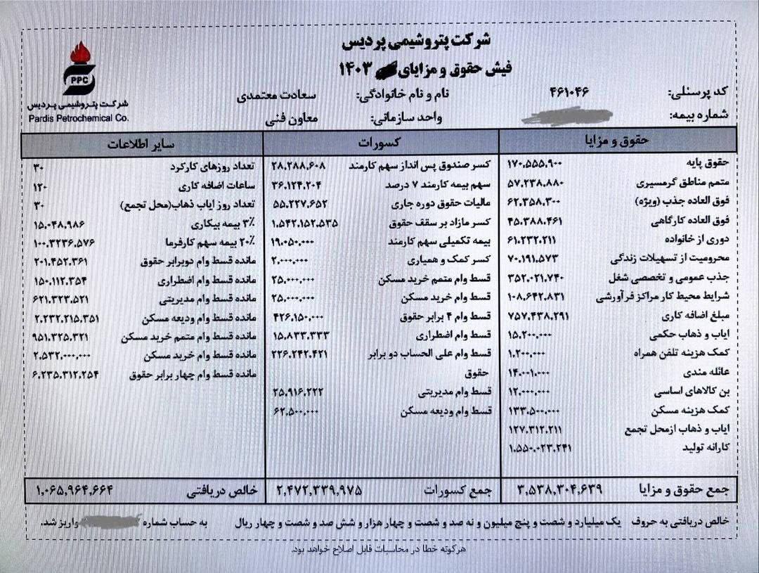 پس از انتشار فیش حقوقی مدیر منابع انسانی پتروشیمی پردیس، فیش حقوقی نجومی سعادت معتمدی، معاون فنی این پتروشیمی نیز عجیب و غریب است.