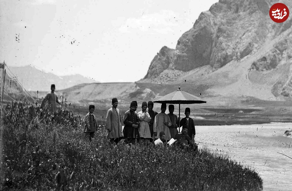 عکس/ ژست ملوکانه ناصرالدین شاه ۱۳۵ سال پیش زیر سایبان در کنار رودخانه لار
