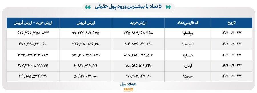 براین اساس، نماد‌های «وپاسار۱»، «آلومینا۱»، «خساپا۱»، «آریان۱» و «سرود۱» بیش‌ترین ورود پول حقیقی به بازار سهام را داشتند.