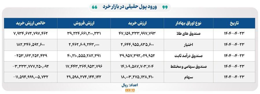 بر پایه این گزارش، ورود پول به، صندوق‌های طلا ۷۹۳ میلیارد تومان، اختیار ۱۸ میلیارد تومان بود.