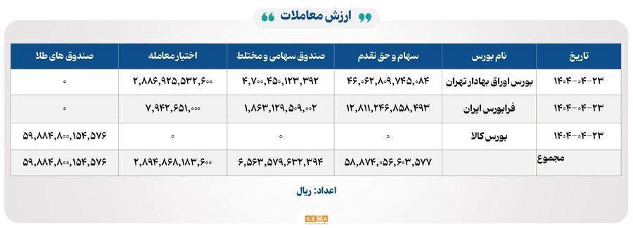 مجموع ارزش معاملات بورس‌ تهران و فرابورس، شامل: سهام و حق تقدم، صندوق‌های سهامی و مختلط، اختیار معامله و صندوق‌های طلای بورس کالا و هم‌چنین مبادلات انجام شده در بازارهای فیزیکی بورس‌های کالا و انرژی به ۳۱ هزار و ۷۶ میلیارد تومان رسید.