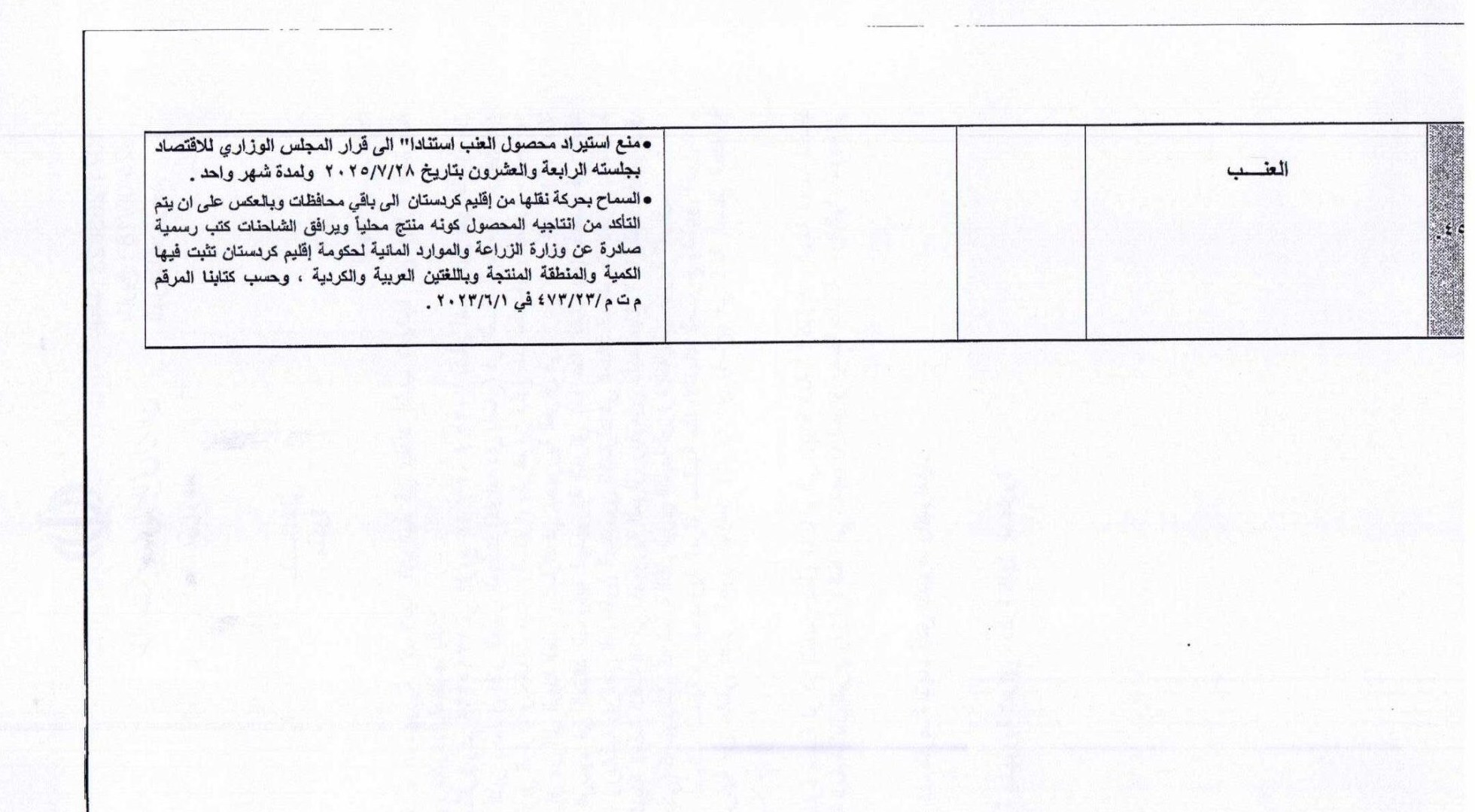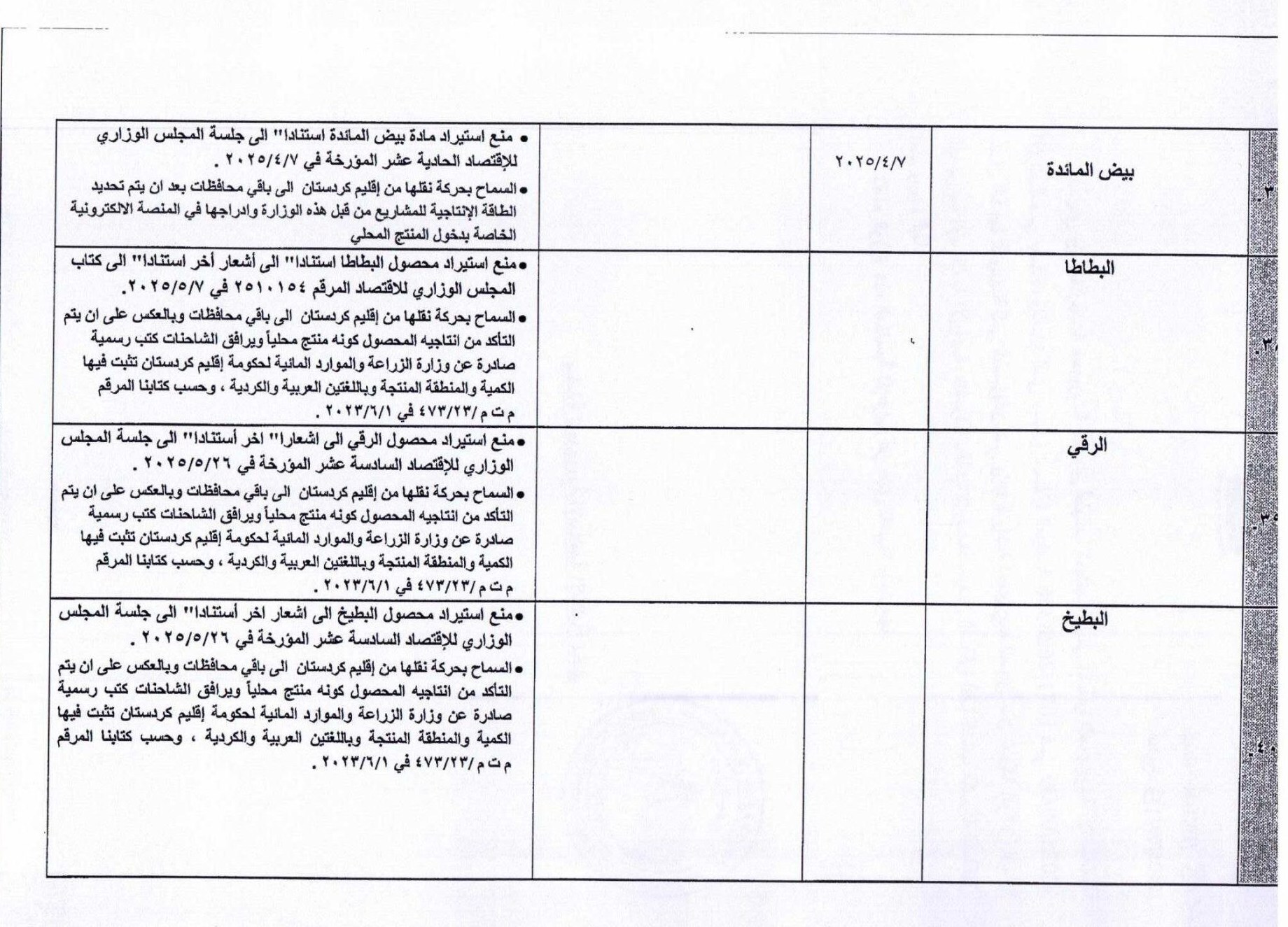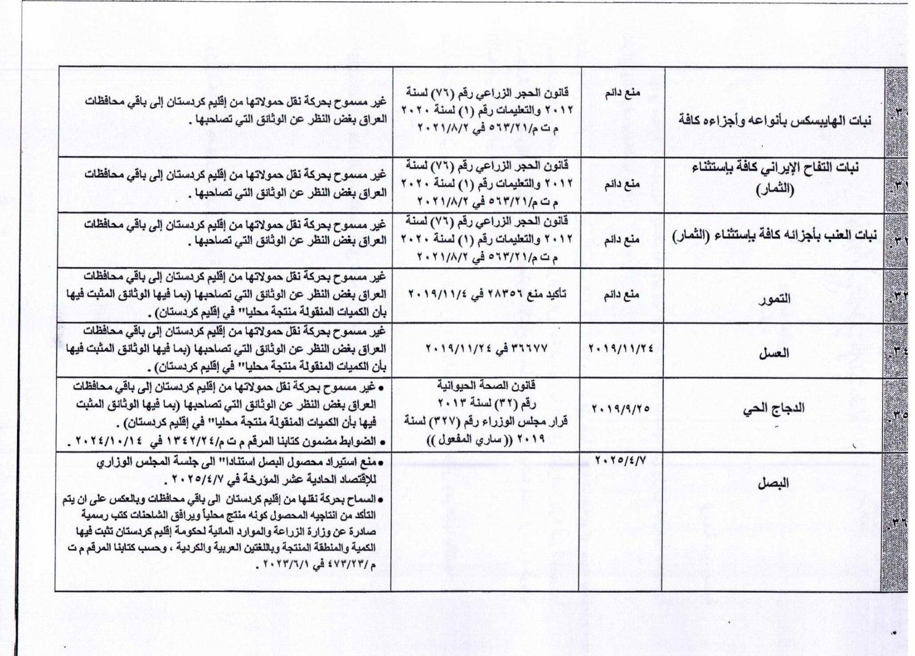دلیل این ممنوعیت در چارچوب استراتژی وزارت کشاورزی عراق و بر اساس تقویم کشاورزی و به دلیل فراوانی تولید داخلی آنها و ثبات قیمتها در بازارهای داخلی آن کشور اعلام شده است.