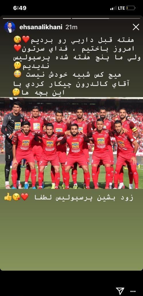 اقتصاد24- احسان علیخانی ، مجری و تهیه کننده تلویزیون که طرفدار سفت و سخت پرسپولیس هم هست، در استوری اینستاگرامش نسبت به شکست سرخ‌پوشان برابر سپاهان واکنش نشان داد و تصویر زیر را در استوری اینستاگرامش منتشر کرد و نوشت: امروز باختیم، فدای سرتون. ولی ما پنج هفته شده پرسپولیس ندیدیم. هیچکس شبیه خودش نیست. آقای کالدرون چیکار کردی با این بچه‌ها. زود بشین پرسپولیس لطفا.