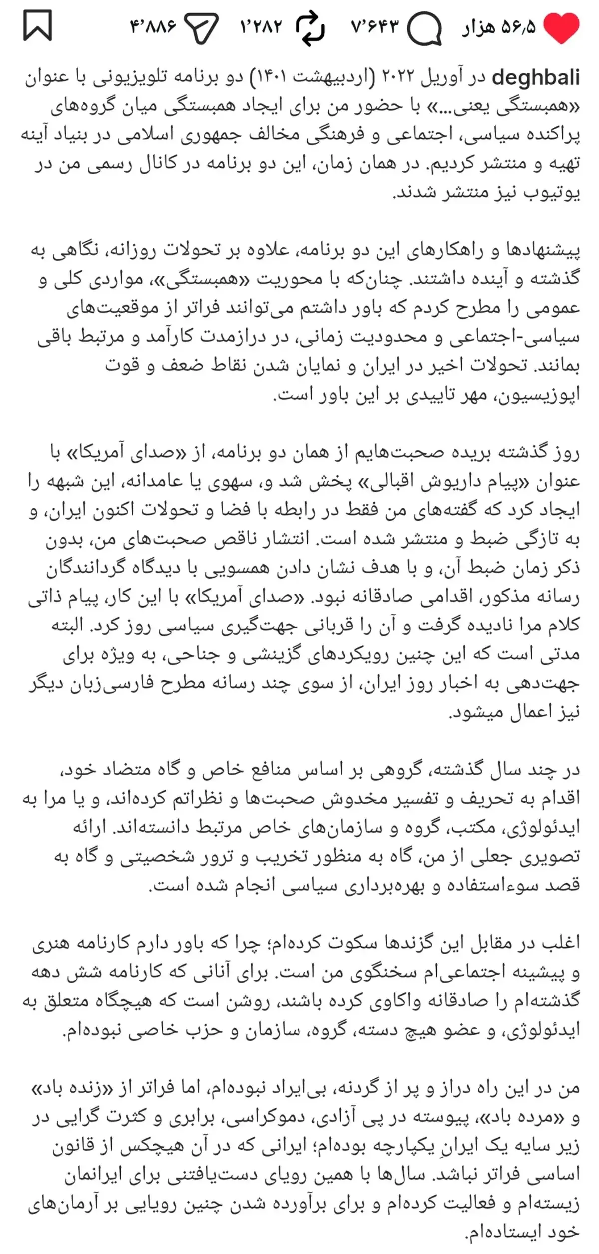داریوش اقبالی با انتشار پیامی، به ویدئویی که «صدای آمریکا» از او منتشر کرده بود، واکنش نشان داد؛ واکنشی که بسیاری آن را «محترمانه، شیک و قابل تأمل» توصیف کرده‌اند.