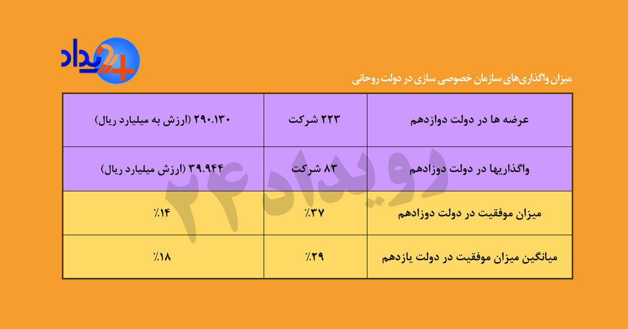 این در حالی است که از این میزان واگذاری، ۲۲ هزار و ۸۱۶ میلیارد ریال بهصورت بلوکی، ۱۷۸ میلیارد ریال تدریجی و ۱۵ میلیارد ریال بهصورت ترجیحی بوده است. همچنین از ۲۲ هزار و ۱۹۳ میلیارد ریال سهم و اموال دولتی در این مدت ۲۰ هزار و ۲۳۶ میلیارد ریال مربوط به شرکتهای گروه یک واگذاریها و یک هزار و ۹۵۶ میلیارد ریال واگذاری مربوط به شرکتهای گروه دو واگذاریها بوده است.