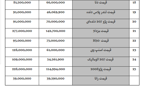 قیمت خودروهای داخلی در بازار امروز 1397/10/16 به شرح زیراست: