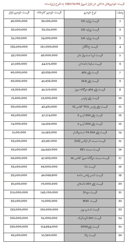 اقتصاد24 - در بازار امروز پراید 111 با قیمت 40 میلیون تومان، پژو206 صندوقدار با افزایش 3 میلیون تومانی با قیمت 72 میلیون تومان ، پژو 206 تیپ 2 با افزایش 1 میلیون تومانی با قیمت 62 میلیون و 500 هزار تومان، پژو206 تیپ 5 با افزایش 1 میلیون تومانی با قیمت 74 میلیون تومان، استپ وی با قیمت 132 میلیون تومان، سمند EF7 با افزایش 2 میلیون تومانی با قیمت 63 میلیون و 500 هزار تومان و رانا با افزایش 1 میلیون تومانی قیمت 61 میلیون تومان مورد معامله قرار میگیرد.